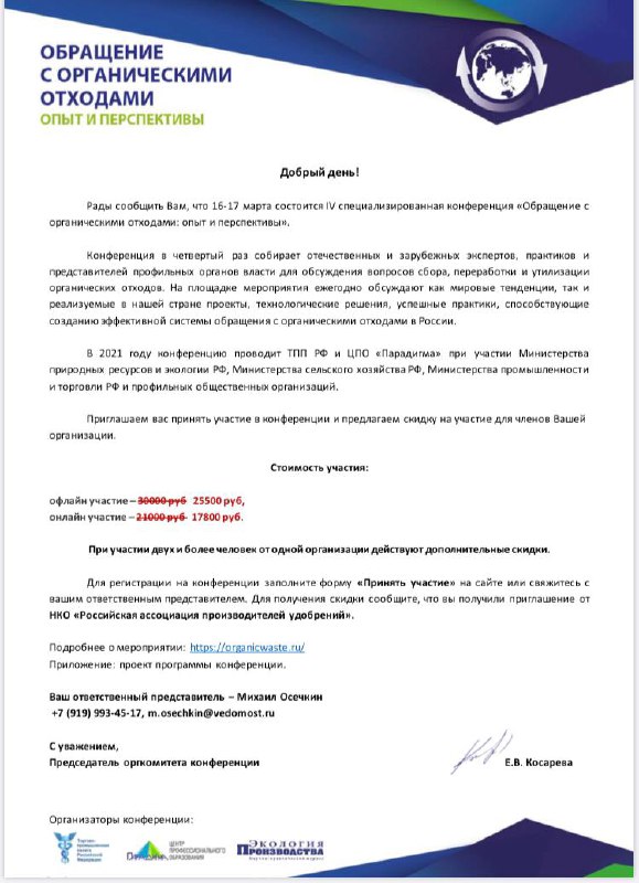 ❗️❗️❗️Внимание! 16-17 марта состоится IV международная конференция «Обращение с органическими отходами: опыт и перспективы». Мероприятие проведут в здании Торгово-промышленной палаты РФ по адресу: г. Москва, ул. Ильинка, д. 6/1, c.1. Конференция соберет отечественных и зарубежных экспертов, практиков и представителей профильных органов власти для обсуждения вопросов сбора, переработки и утилизации органических отходов. В центре внимания мировые тенденции, проекты, реализуемые в России, технологические решения, позитивные и негативные практики, способствующие или препятствующие созданию эффективной системы обращения с органическими отходами в России. Для подписчиков информационных ресурсов РАПУ скидка 15% по коду "ОТ РАПУ".