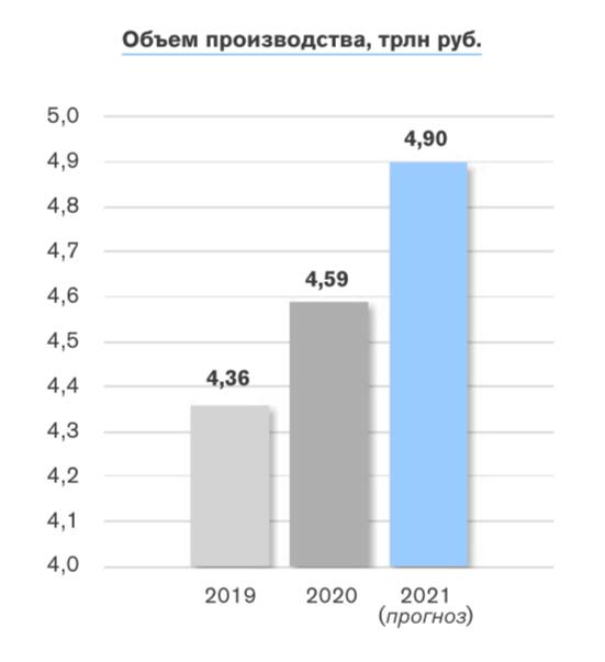 Объём производства российского химического комплекса в 2021 году по прогнозам приблизится к 5 трлн руб., по итогам прошлого года он составил 4,59 трлн руб. Это следует из данных Минпромторга, обнародованных перед итоговой коллегией ведомства. Объём экспорта должен составить $22,6 млрд, увеличившись с $19,9 млрд в прошлом году. В числе ключевых проектов, реализованных в отрасли в 2019-2020 гг, в министерстве назвали запуск Акроном нового агрегата по производству азотной кислоты в Великом Новгороде, открытие нового завода ЕвроХима по производству аммиака в Ленинградской области и начало работы завода КуйбышевАзота по производству серной кислоты и олеума в Самарской области.