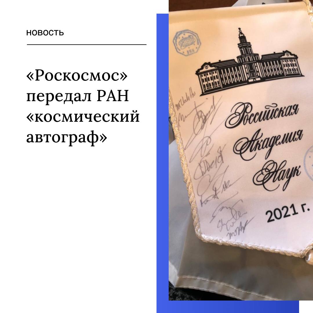 Сегодня представители государственной госкорпорации «Роскосмос» передали Российской академии наук вымпел с подписями всех членов экипажа Международной космической станции (МКС).