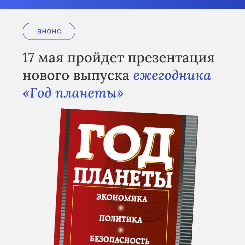 17 мая в 11:00 в ИМЭМО РАН в конференц-зале имени академика Н.Н. Иноземцева состоится презентация очередного (посвященного итогам 2020 года) выпуска ежегодника «Год планеты».