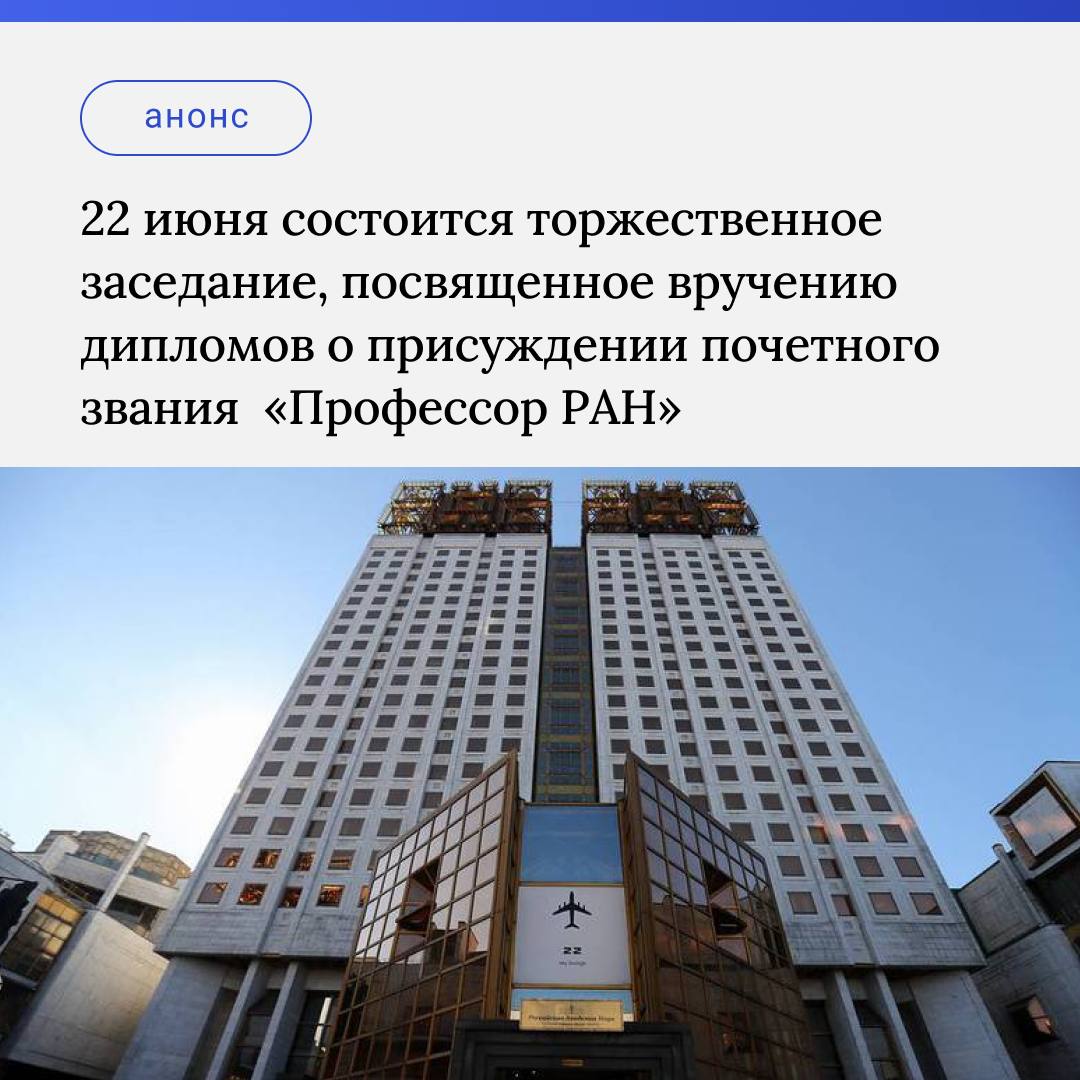 22 июня в 10:00 (мск) в Президентском зале РАН состоится торжественное заседание, посвященное вручению дипломов о присуждении почетного звания «Профессор РАН».