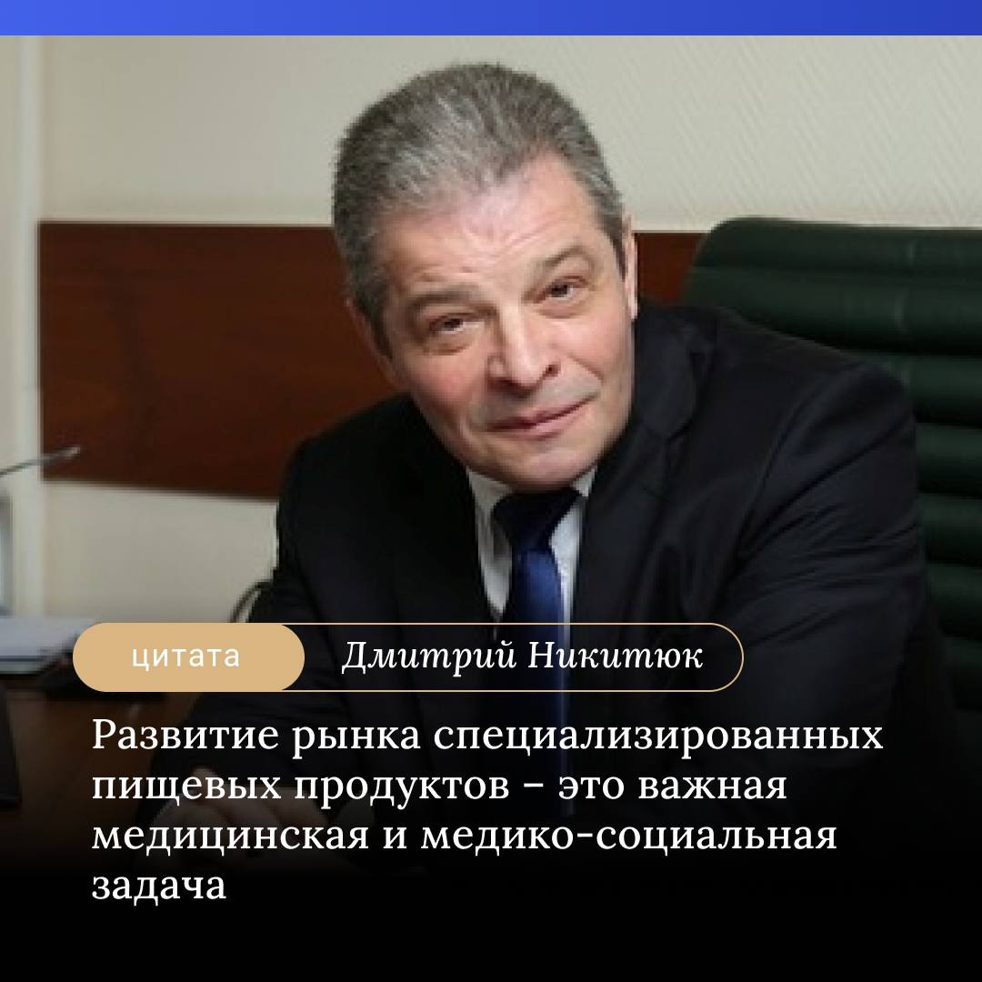 «Создать рацион питания без специализированных пищевых продуктов в нынешних условиях, когда энерготраты у усредненного мужчины 2200-2300 ккал, у женщин и того меньше, весьма сложно. Поэтому развитие рынка специализированных пищевых продуктов – это важная медицинская и медико-социальная задача. Реалии сегодняшнего дня таковы, что в мире специализированные пищевые продукты составляют примерно 5 % от общего объема пищевой продукции, в ряде стран эти показатели выше. В России они минимальные», - отметил член-корреспондент РАН Дмитрий Никитюк.