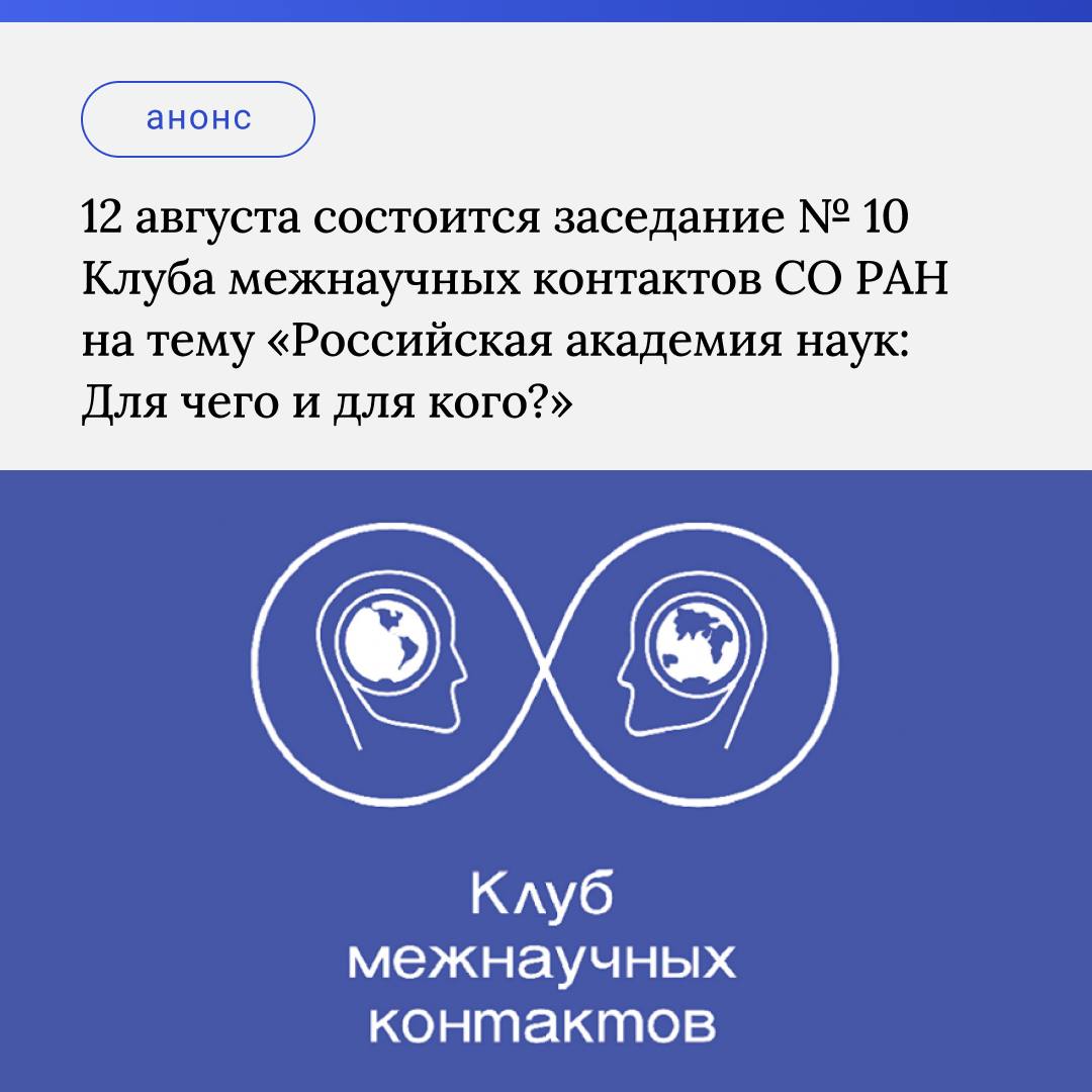 Приглашаем вас принять участие в заседании № 10 Клуба межнаучных контактов СО РАН на тему «Российская академия наук: Для чего и для кого?», которое состоится 12 августа, в 17:00 (по новосибирскому времени), в Малом зале Дома ученых (смешанный формат заседания очно/zoom).