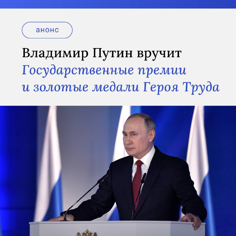 Президент РФ Владимир Путин также вручит золотые медали «Герой Труда Российской Федерации» россиянам, удостоенным этой награды.
