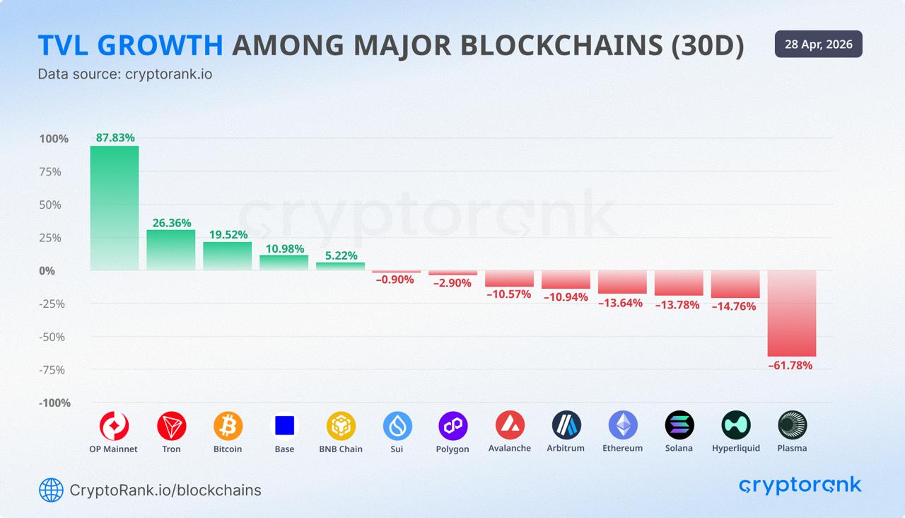 In the last 30 days, OP Mainnet saw a massive surge of +87.83% in TVL, largely driven by the migration of Ether.fi to its network.