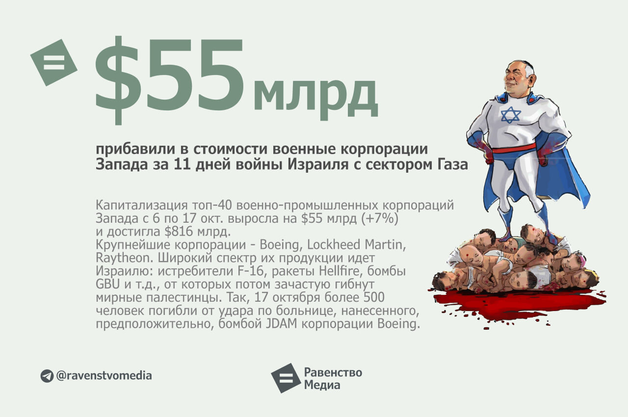 За 11 дней боевых действий Израиля с сектором Газа капитализация топ-40 военно-промышленных корпораций Запада выросла на $55 млрд (+7%) и достигла $816 млрд, подсчитало «Равенство» по данным фондовых бирж. В выборку попали компании, у которых более 1/2 выручки приходится на ВПК, а капитализация выше $1 млрд. До этого на фоне провала контрнаступления ВСУ капитализация корпораций падала, потеряв за 4 месяца те же 7% ($58 млрд).