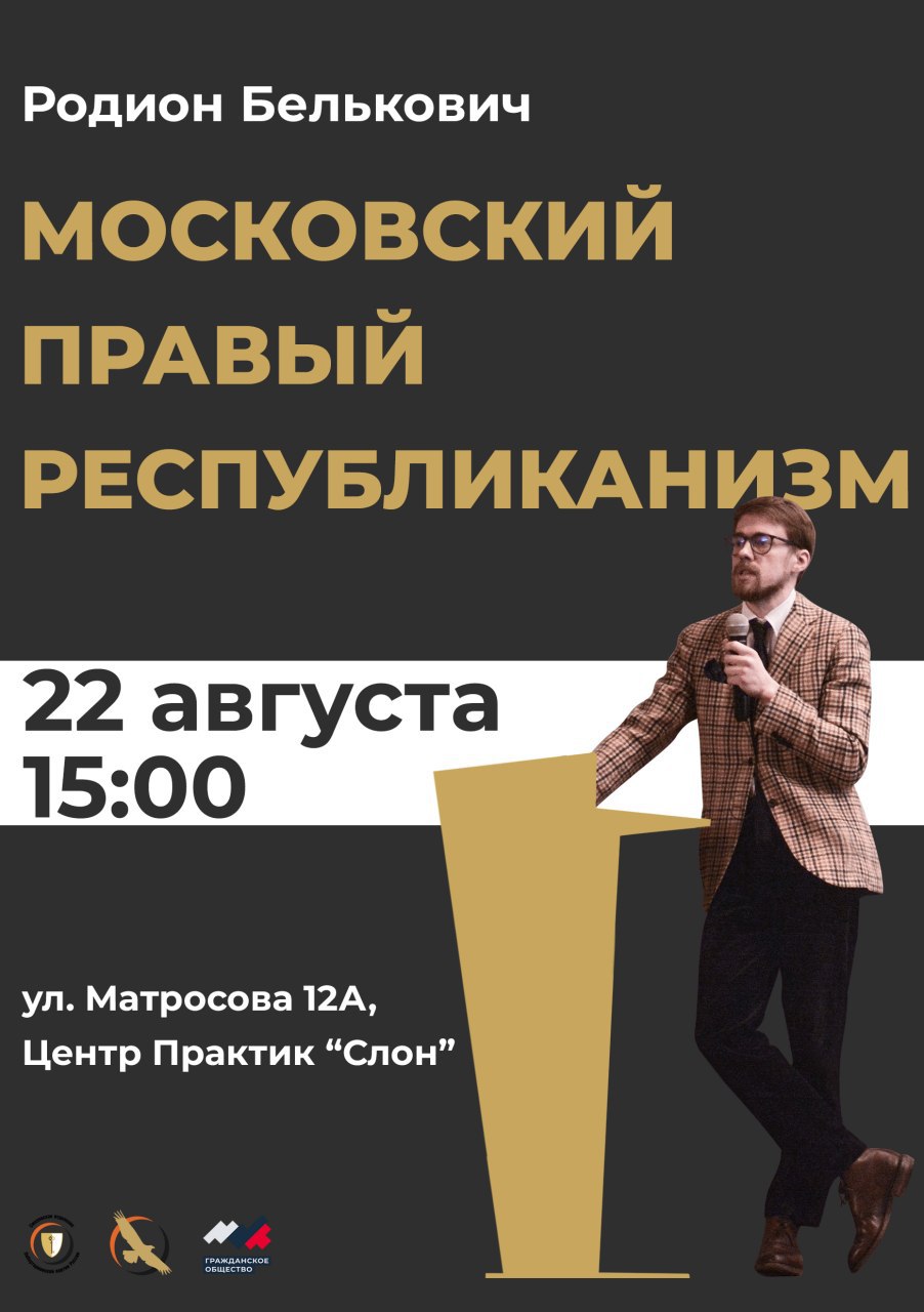 В субботу, 22 августа, при поддержке «Гражданского общества» пройдет лекция руководителя Центра Республиканских Исследований, доцента кафедры теории и истории права ВШЭ, а также кандидата юридических наук – Родиона Бельковича. Это важное событие для интеллектуальной жизни Смоленска, ведь не так часто к нам заглядывают такие интересные гости. В рамках лекции спикер поднимет тему правого республиканизма и поделится своими взглядами на этот вопрос.