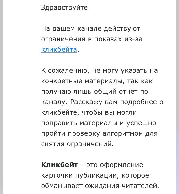 И так, стала известна причина ограничения моего последнего канала. И.... барабанная дробь... кликбейт. Как я и предполагал.