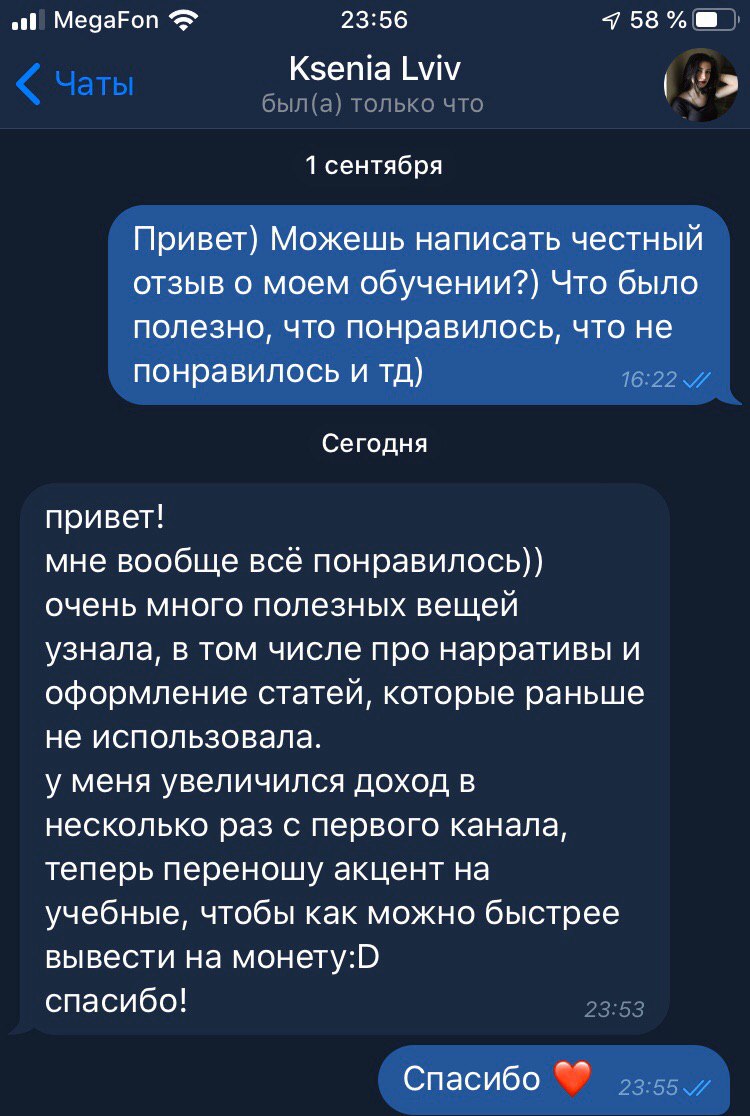 Эта прекрасная девушка выиграла в конкурсе место на обучении и, самое главное, не забила на него, а обучилась и смогла увеличить в несколько раз прибыль на своём основном канале. Ну не умничка ли? ☺️