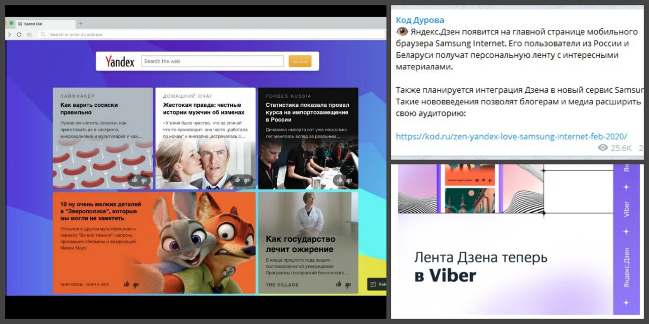 И третьей, последней на данный момент, партнеркой является браузер Viber, в котором также должны будут появиться (или уже появились) статьи с Яндекс Дзена. Кто пользуется этим мессенджером, напишите мне в бота, есть ли там уже статьи или нет. UPD: Спасибо Дарье Аникушиной, которая проверила это и сообщила, что статьи там действительно есть.