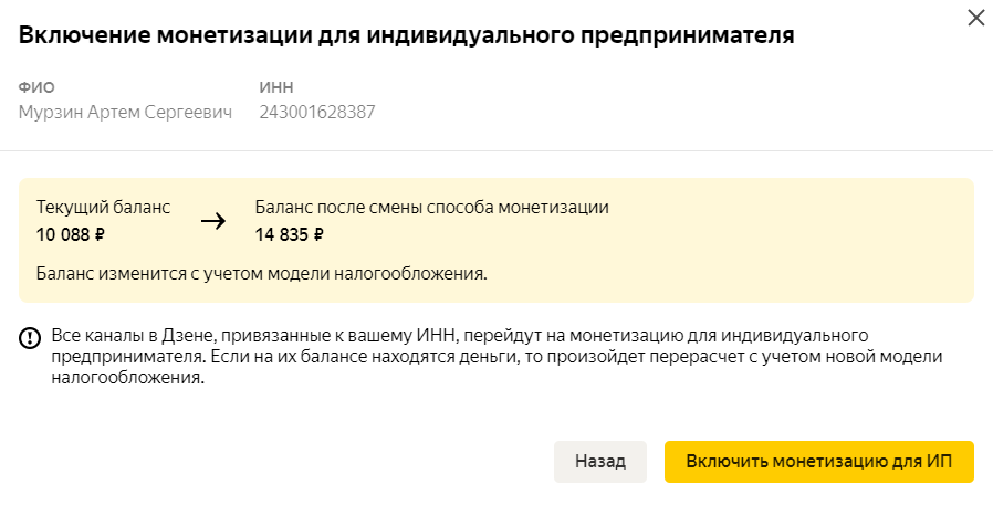 Если вы меняете модель налогообложения на Яндекс Дзене, не выводите деньги, пока не включите нужную модель. Чтобы включить режим заработка на ИП, мне пришлось перейти на физ.лицо, из-за чего баланс изменился с учетом 40% отчислений в пользу государства.
