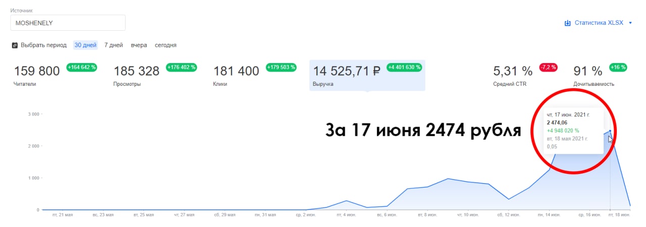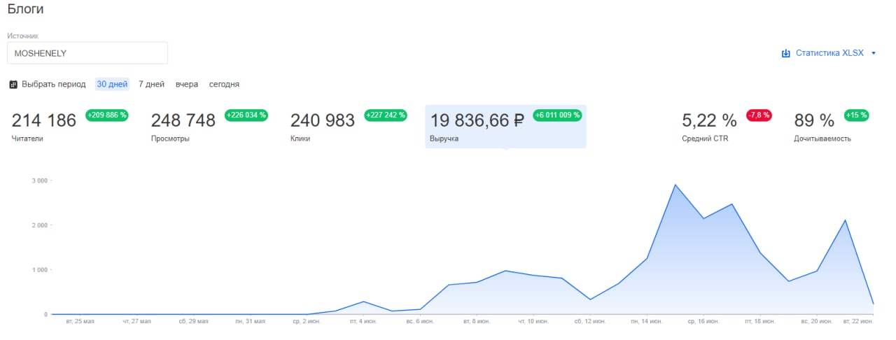 Аудитория основного канала (MOSHENELY) составляет уже 500к+ человек за месяц. Всё это вы видите на реальном скриншоте из кабинета паблишера (внизу поста).