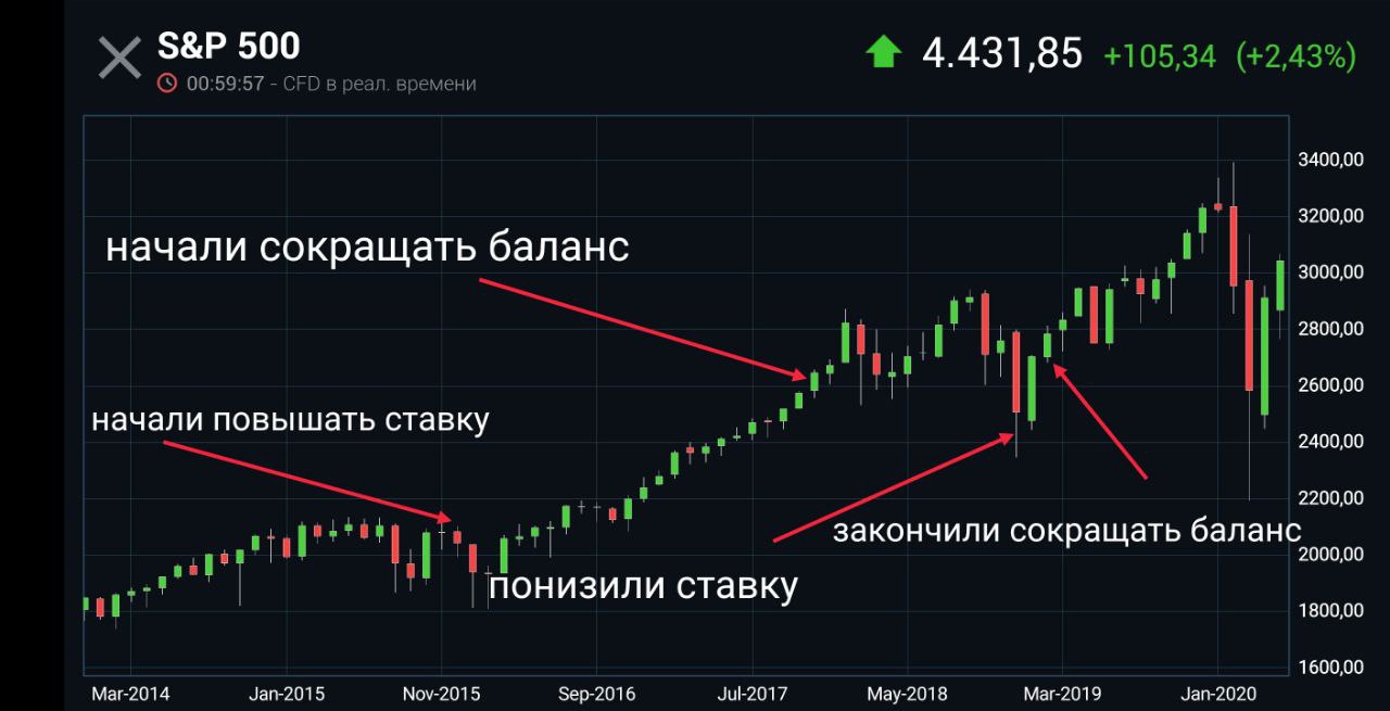 На месячном графике S&P 500 я отметил отрезки, когда ФРС начал повышать ставку и сокращать баланс, и соответственно, когда цикл повышения ставки и сокращения баланса закончился.