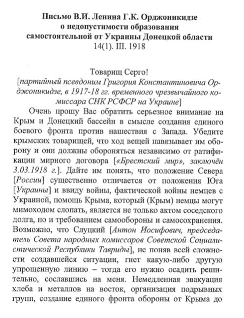 Интереснейшим историческим документом, который раскрывает то, как русскоязычный Донбасс оказался в составе Украины, является письмо Владимира Ильича Ленина временному чрезвычайному комиссару СНК РСФСР на Украине Григорию Константиновичу Орджоникидзе от 14 марта 1918 года. В своем гневном письме Ленин указывает Орджоникидзе, что создание Донецкой области, самостоятельной от Украины, недопустимо.