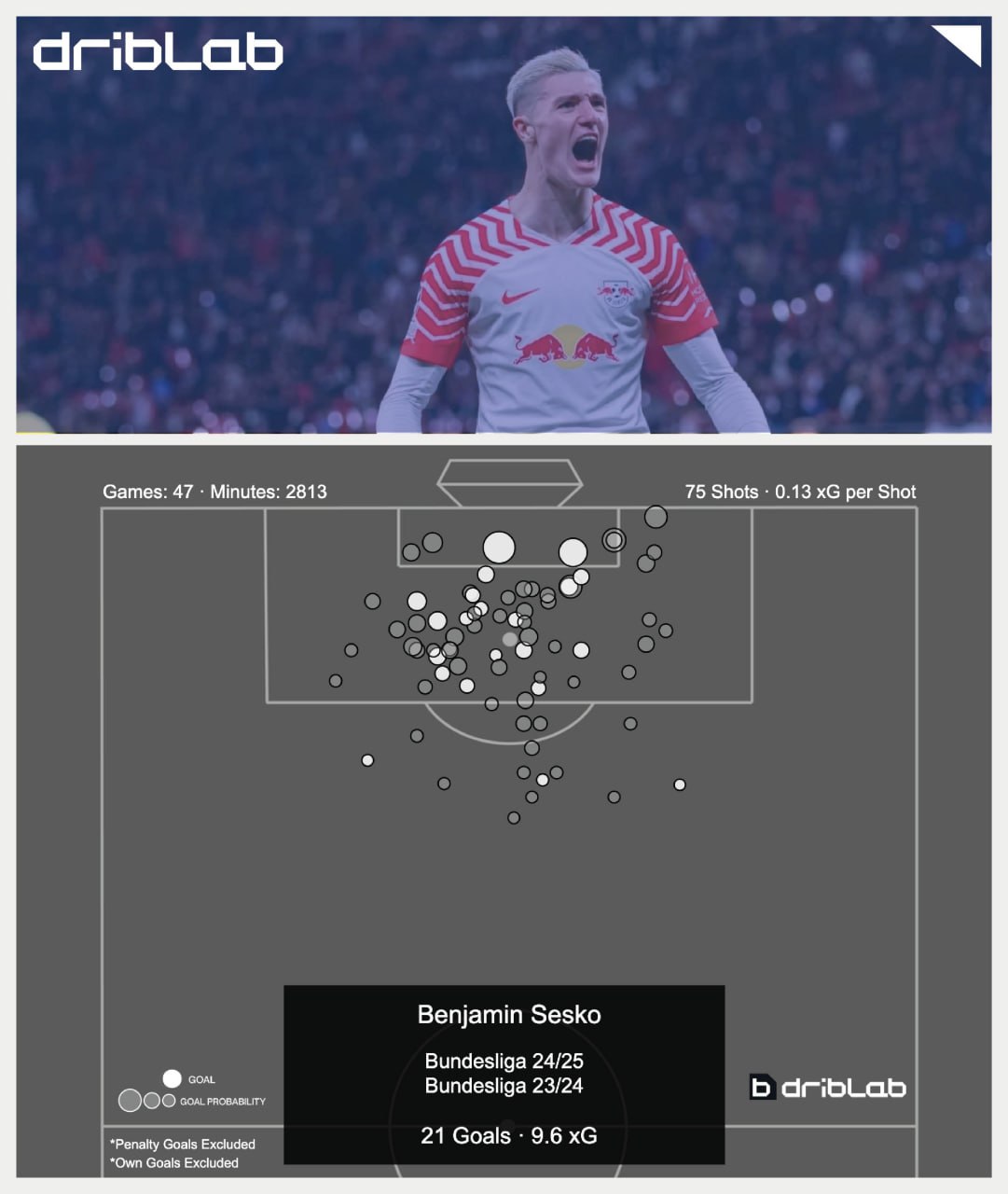 Абсолютно все форварды «Лейпцига» (кроме, пожалуй, Поульсена), игравшие за команду с момента её дебюта в Бундеслиге, запоминались мощнейшими выступлениями. У каждого из них сезонная амплитуда G-xG была не просто стабильно положительной (в среднем ≈ +3), но подчас и необоснованно завышенной, т. е. граничащей с откровенным оверперформом.