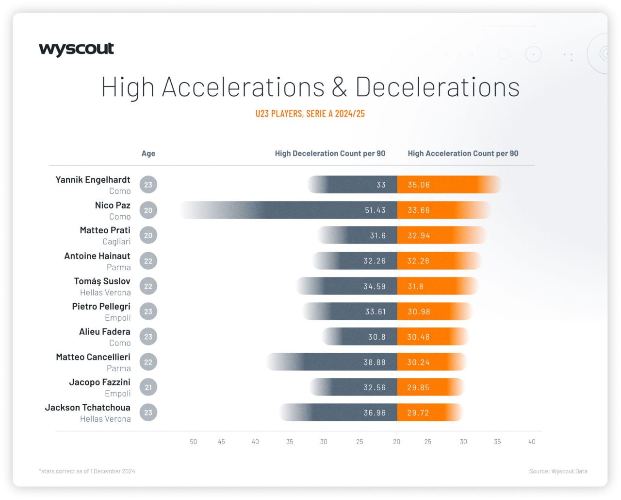 Сразу трое проспектов «Комо», – Энгельхардт, Пас и Фадера, – вошли в рейтинг High accelerations and decelerations (высокие/высокоинтенсивные ускорения и замедления). Для контекста: среднее ускорение – от 1,5 м/с до 3 м/с, а высокое – от 3 м/с и выше; с замедлениями наоборот – среднее значение измеряется от -1,5 м/с до -3 м/с, а высокое – от -3 м/с.