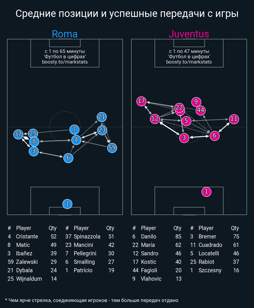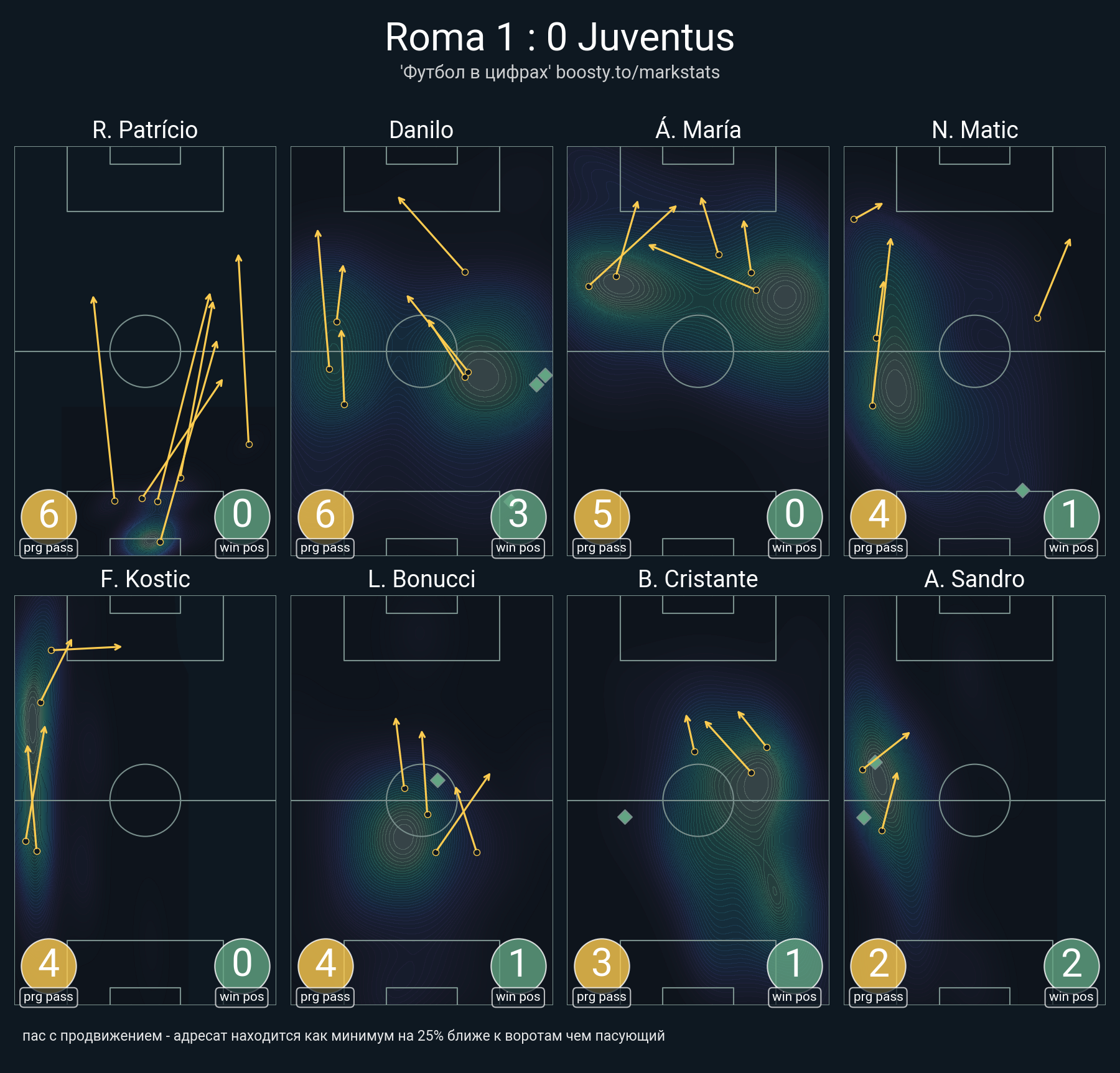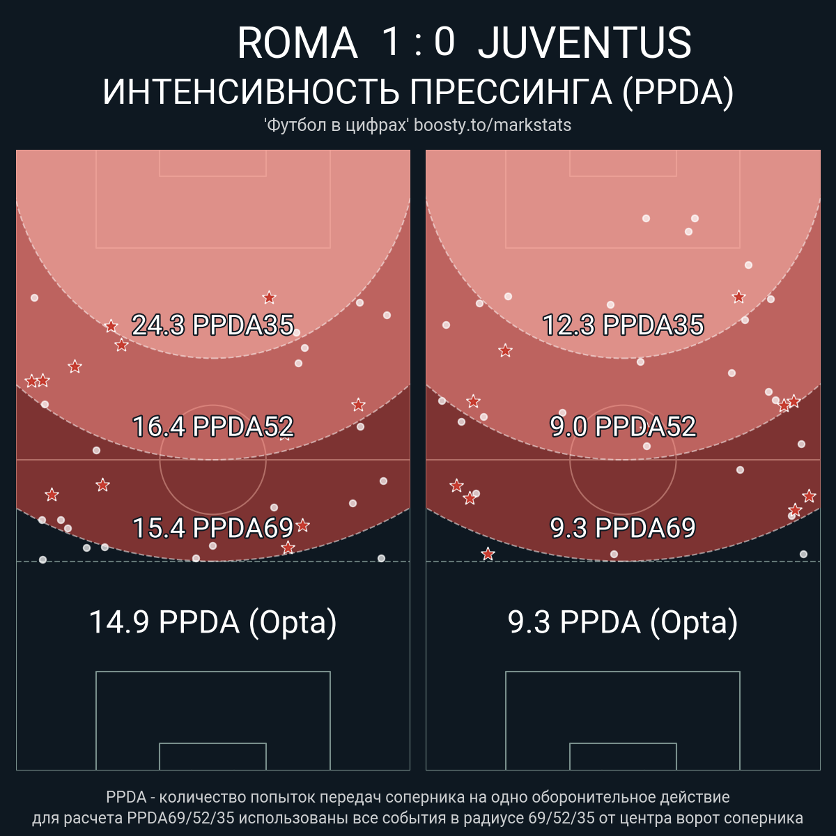 И ещё про пару метрик. Очевидно, что по всем поверхностным показателям банда Аллегри превзошла своих визави. Однако, если мы обратимся к интенсивности прессинга, выяснится, что римляне не просто обскакали туринцев в этом аспекте, но и создавали куда более грамотное и, если угодно, более детализированное давление. Примечательно, что даже в те отрезки, когда «Ювентусу» критически важно было поддавить соперника, «Рома» сохраняла высоту блока (настолько, насколько это возможно при футболе «Особенного»). Что касается передач с продвижением игры, не хотелось бы умалять роли Патрисио. Да, большинство его лонгболов — банальные выносы, однако как минимум один из них был выполнен не при выбивании мяча из своей штрафной, а ещё один привёл к опасной атаке.
