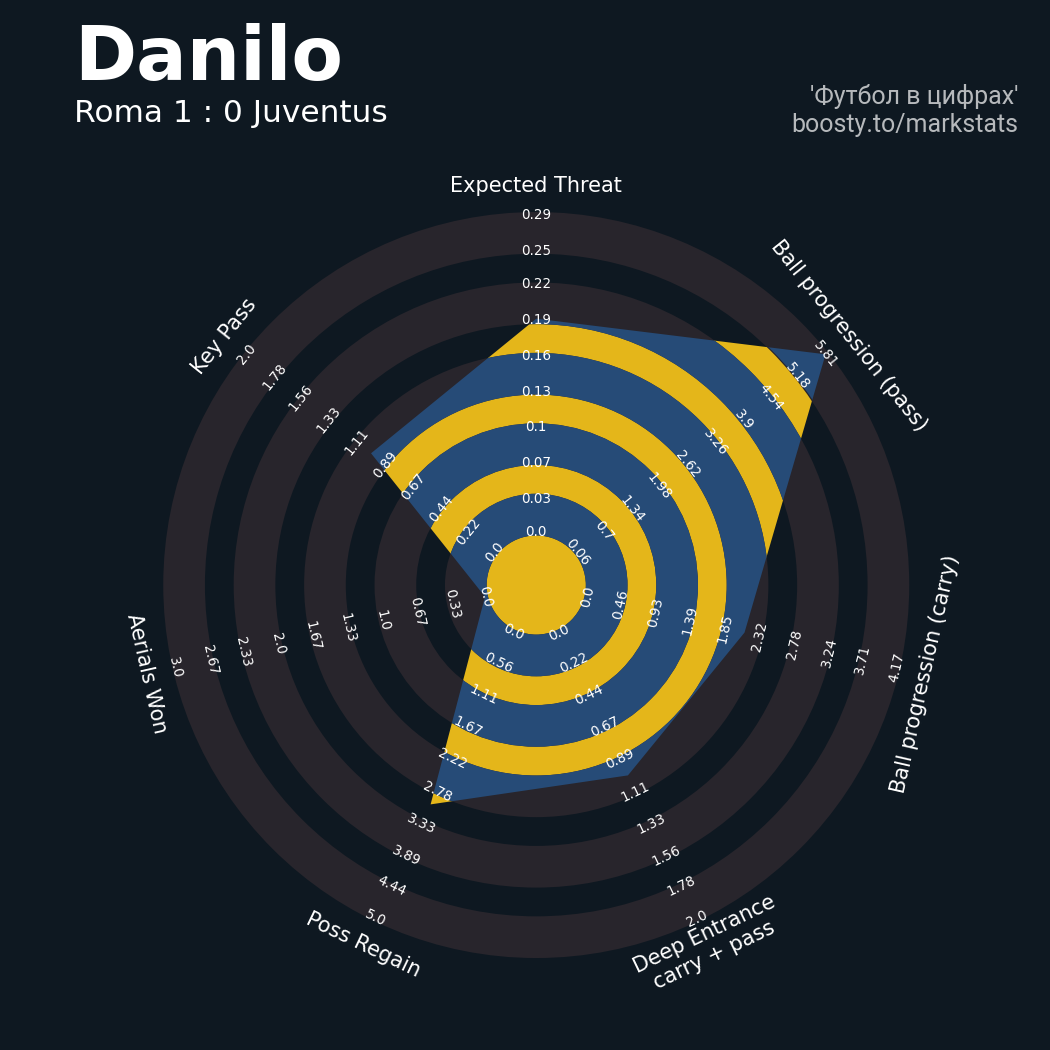 Напоследок заострю внимание на фигуре Данило. Есть игроки, которым просто не повезло находится в команде проигравших. Вчера этот тезис вполне был бы применим к бразильскому правому защитнику. Бессмысленно петь дифирамбы футболисту проигравшей команды, однако объективности ради, Данило отлично отработал сразу на нескольких фронтах. Наглядным доказательством этому служит и его многоугольник силы, где все показатели, находящиеся справа, говорят об уровне игрока. Присовокупите сюда позицию бразильца, а также паршивенький перфоманс Фаджоли, которого надо было страховать, и станет очевидно, кто мог бы стать MVP при положительном результате для гостей. Но футбол, впрочем как и история, сослагательного наклонения не имеет.