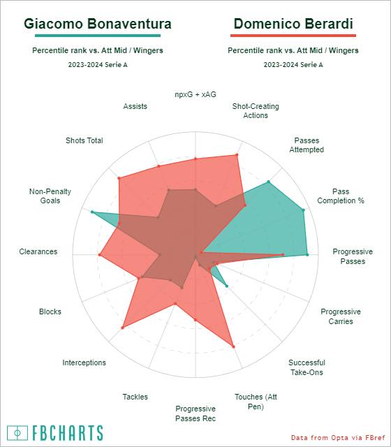 Подобная двужильность в 34 года не может не импонировать, особенно при сопоставлении с а) усредненными значениями вингеров; б) цифрами ярчайшего представителя АПЗ. Как видно, Бонавентура не просто великолепен в ключевых созидательных метриках, но и обошел Берарди по NPxG.
