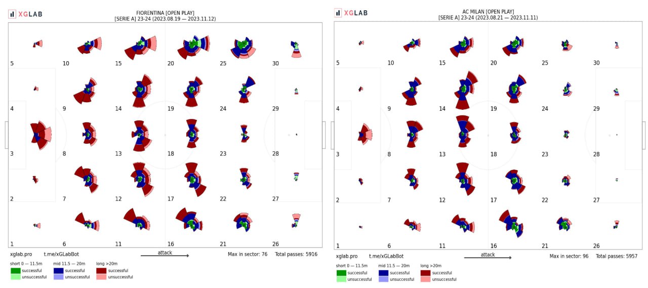 Огранка агрессивного и сверхдинамичного билд-апа «Фиорентины» в этом сезоне привела к формированию новых паттернов развития атаки. В частности, Итальяно сделал так, чтобы возросло число средних передач в полуфлангах, что помогло разгрузить атакующий ромб, лишив его необходимости принимать неудобные длинные передачи со своей половины. Упал не только процент лонгболов, но и всех передач > 20 м, а следовательно значительно снизилась и доля брака. Как наглядно следует из инфографики, «фиалки» стали чаще искать варианты выхода из-под прессинга за счёт в некоторой степени рискованных длинных передач назад вратарю, по возможности не ставя под удар опорника.