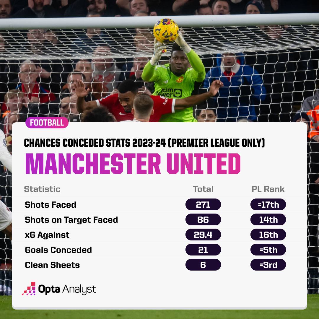 Opta вновь балует статистикой, подогревая и без того раздутый интерес к Онане. В частности, аналитики апеллируют к количеству сейвов камерунца - только Бернд Лено (73) и Уэс Фодерингем (81) совершили их больше в Премьер–лиге в этом сезоне, чем Андре (65).