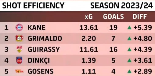 Так в режиме реального времени выглядит разница между ожидаемыми и забитыми мячами Кейна теперь, после гола «Штутгарту». Последний раз подобная голевая амплитуда на столь короткой дистанции турнира фиксировалась в Европе свыше трёх лет назад - в первый сезон Холанда в Бундеслиге.
