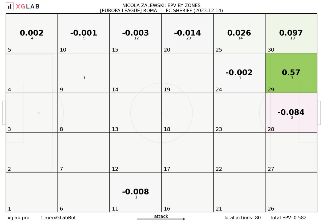 Апдейт ко вчерашнему посту, подтверждающий догадки по Залевскому. Никола и впрямь оказался лидером по EPV, причём в профильной зоне ценность его владения оказалась отрицательной – сильно упрощая, в родном амплуа игрок отметился деструктивом. Зато из итоговых 0.582 почти вся архитектура полезности держится на левом полуфланге в чужой штрафной (0.570). Феноменальный показатель!