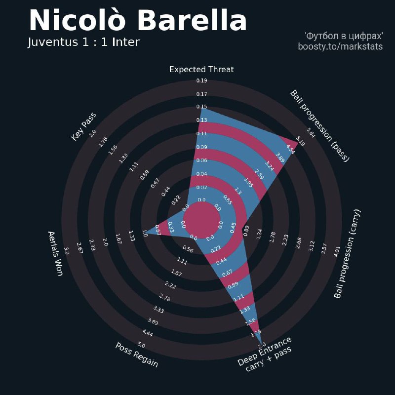 Однако вчерашний перфоманс в Derby d'Italia вполне показателен для Бареллы в нынешнем розыгрыше чемпионата Италии: невыразительные метрики key pass и ball progression как отображение неприятной действительности: больше брака в передачах; меньше смелости в действиях; возросшее желание расстаться с мячом быстрее, чем это было прежде. Whoscored закономерно поставил самому яркому в недавнем прошлом итальянскому футболисту наименьший балл среди всех «нерадзурри»…
