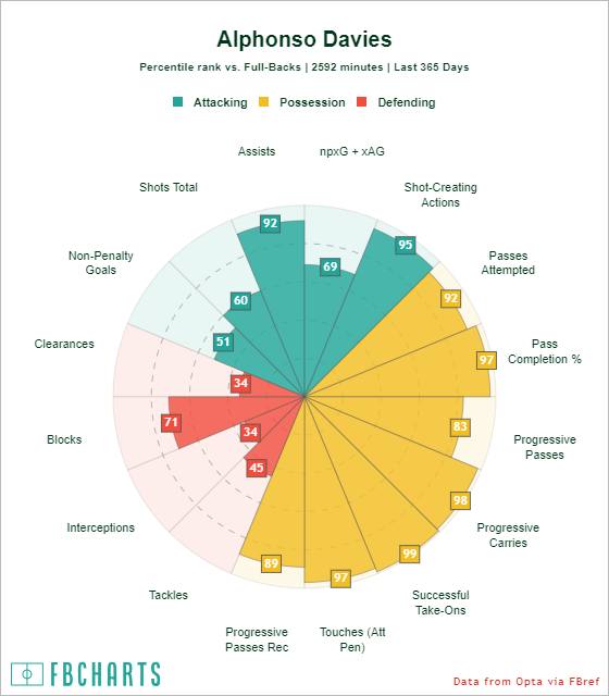 Так выглядит круговая диаграмма лучшего (по мнению FourFourTwo) ЛЗ мира Альфонсо Дэвиса. В нынешних реалиях номинант, конечно, дискуссионный, но отличительное качество канадца, предопределившее, как мне кажется, вручение ему пальмы первенства - стабильность. Да, именно стабильность, а не двужильность и трудоголизм, коими он славился ранее.