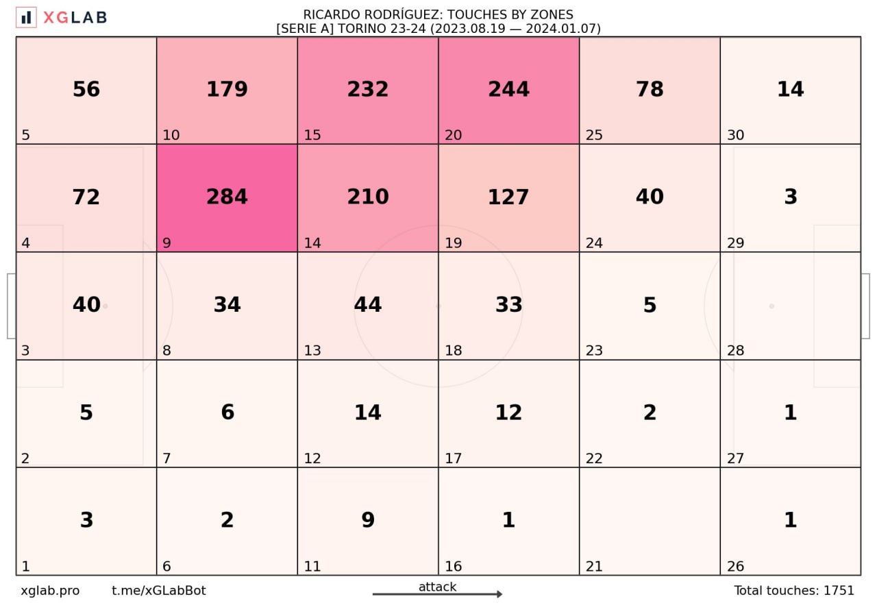 С течением времени цифры PPDA впечатляли всё меньше, а футбол туринцев из сугубо вертикального стал характерно горизонтальным: с чётко прописанным позициями латералей и не таким вязким центром поля. Куда интереснее, однако, другое – Юрич подыскал-таки для своего любимчика новую профильную позицию. Рикардо окончательно заматерел не в опорной зоне и даже не в роли левого защитника, а в качестве полноценного бровочника, причём, как оказалось, двужильного. Обратите внимание на количество его касаний на левом фланге – зоне, ранее чуть ли табуированной в команде (так как Юрич принципиально не хотел играть широко). В новой системе координат швейцарец прижился, а забуксовавший «Торино» смог найти точку опоры, оттолкнувшись от которой уверенно следует новому курсу. Впрочем, учитывая жадность клубного менеджмента, красноречиво сказывающуюся на длине скамейки запасных, максимум для этого ростера – ближайшие пару мест в таблице после еврокубковой зоны.