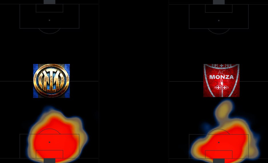 В розыгрыше 2023/24 тенденция налицо: тройка ЦЗ полностью возложила на себя функции розыгрыша мяча от ворот, они же по возможности не отдают Зоммеру обратные пасы, особенно находясь под давлением. Строго говоря, функционал Яна сведён к классическому вратарскому набору: игра на ленточке и дальние выносы. Упомянутый в самом начале Ди Грегорио, чью вратарскую дуэль со швейцарцем нам, к сожалению, не доведётся сегодня понаблюдать, выполняет значительно больше разносторонних действий. Особенно это касается игры Микеле в роли либеро и на подстраховке ближе к центральному кругу. Вот, например, сравнение тепловой карты Зоммера и Ди Грегорио.