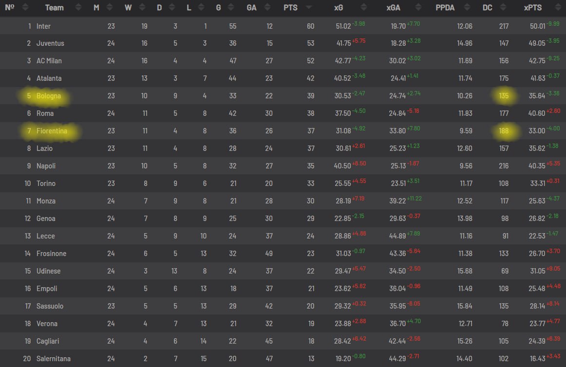 Ожидаемо, у обоих клубов оверперформ по забитым голам и очкам. Более того, у «фиалок» разница xG – xGA (31.08 – 33.80) и вовсе отрицательная: сказалась, в частности, недавняя серия из трёх побед по 1:0, когда флорентийцы в совокупности должны были пропустить не менее 4-5 мячей, но умудрились сохранить ворота в неприкосновенности во всех играх. У «Болоньи» закономерно возросло число «высоких» возвратов владения, а также участился гибридный средне-высокий блок. Как итог, подопечные Мотты вышли на третье место по среднему PPDA – уже 10.26. К слову, «Фиорентина», чьими прессинг-ловушками и высоким давлением мы восхищались весь прошлый сезон, в нынешнем (9.59) уступила пальму первенства «Наполи» (9.56).