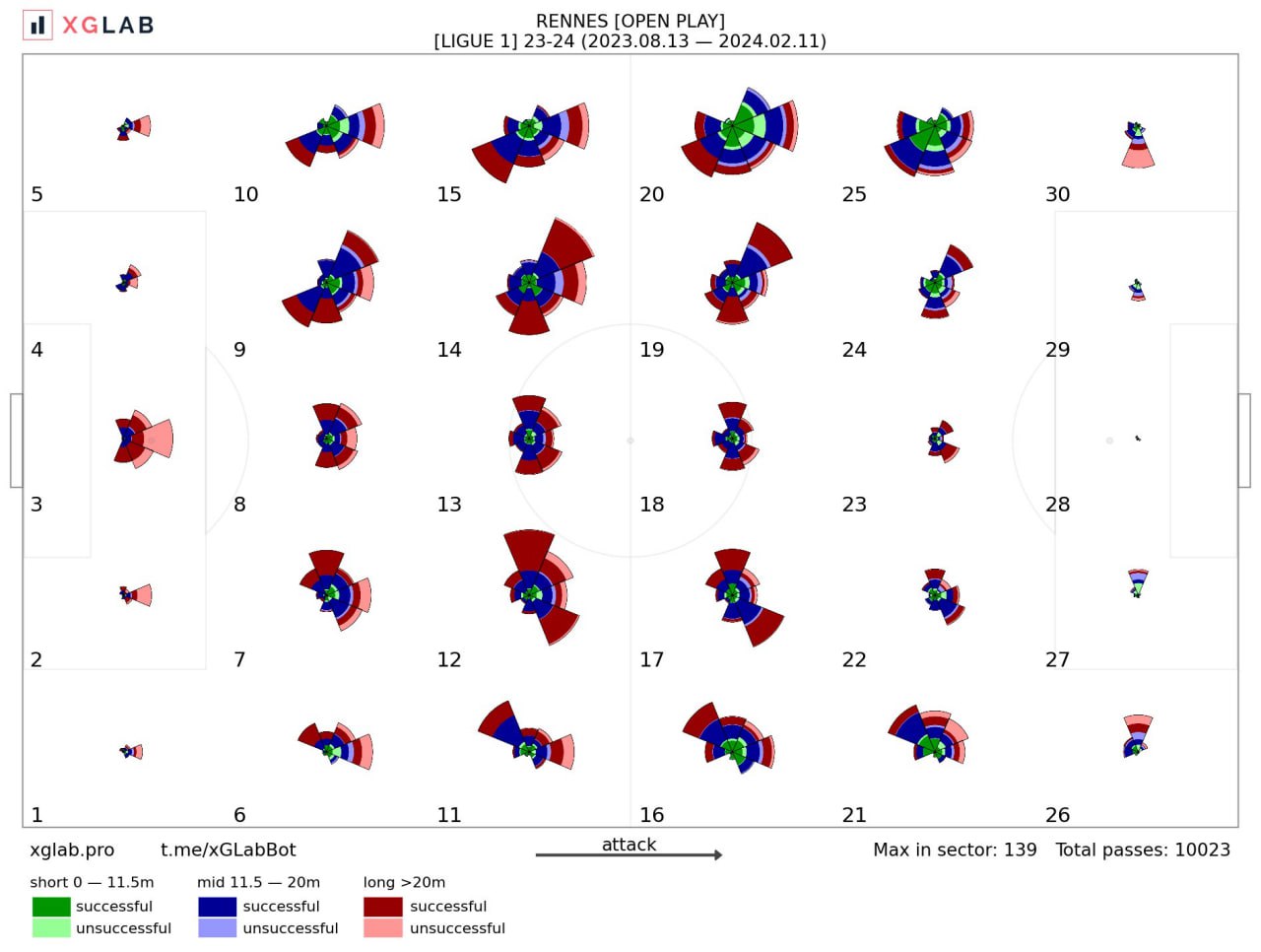 Жюльен Стефан подхватил бретонцев в ноябре, переняв эстафету от Брюно Женезьо. Последний оставил преемнику громоздкое наследие в виде переполненного лазарета, очень сложной архитектуры билд-апа и отсутствующих как класс флангов. Словом – конструктор со сломанными деталями. Стефан чинит «Ренн» до сих пор, параллельно экспериментируя со схемами: сейчас, например, излюбленной формации у Жюльена нет. За неполные три месяца коуч перепробовал три игровых рисунка и четырёх футболистов на позиции «крайков». Рокировки Стефан проводил точечно – всегда по сопернику, а главное, отталкиваясь от кондиций своих исполнителей здесь и сейчас. Кроме того, бретонцы почти полностью отказались от короткого паса: да, это не в тренде, но для клуба подобный ход стал панацеей, особенно в матчах, когда нужно сыграть вторым номером (сегодня как раз такой случай, поэтому сравните инфографику с картой передач «Милана»). Апофеозом адаптивности стали последние пять матчей в рамках французского первенства. В этот интервал 43-летний рулевой сыграл: