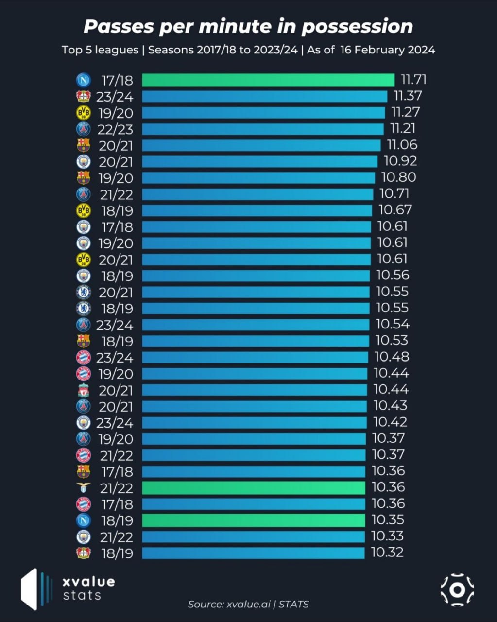 Ниже – самая тиражируемая за сегодня футбольная инфографика. Лично мне в глаза бросается даже не очередное подтверждение всесторонней крутости «Байера» в этом сезоне (новый концепт выхода из-под прессинга через короткий пас – лучшее, что придумал Алонсо в этом сезоне, но высокое положение его подопечных в таблице не удивляет) и не сверхдинамичный и вертикальный «Наполи» Сарри образца шестилетней давности, а… нынешняя «Бавария». Уточню, что в выборке представлено 700 клубов за 7 сезонов. Согласитесь, неожиданно высокое место для команды, в которой ключевой плеймейкер при разгоне атаки регулярно тянет с пасом, а второй розыгровщик почти всегда проигрывает силовую дуэль опекуну, то есть, опять-таки теряет мяч в необязательных ситуациях.
