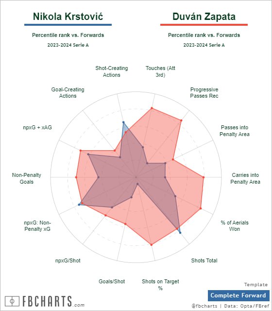 Сапата и Крстович – значительно более похожие друг на друга нападающие, нежели может показаться. Пожалуй, из их диаметрально противоположных качеств можно выделить разве что подход к позиционной игре: Дуван, конечно, значительно сильнее в этом компоненте в силу опыта, но Никола чрезвычайно настойчив, чем старается компенсировать неумение вовремя открыться под передачу.