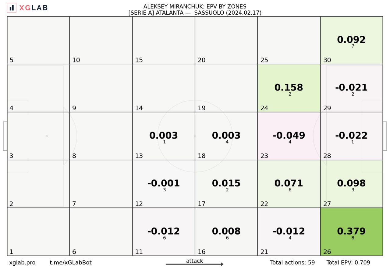 Теперь уже не секрет, что Миранчук прямо сейчас находится на лучшем отрезке своей европейской карьеры, параллельно укрепляясь в статусе игрока основной обоймы команды Гасперини. Вчера он непривычно много (даже по меркам последнего месяца) брал на себя: 3 удара (все в створ), почти единица по индивидуальному xG, 3 ключевых передачи, лучший в игре по обводкам (3 из 4 – успешные), 6 касаний в чужой штрафной. Из 3 голов «Аталанты» 2 – плоды его непосредственного участия. Кроме того, Алексей стал первым футболистом «Аталанты», кому удалось преодолеть отметку в 0.7 EPV за матч в 2024-ом.