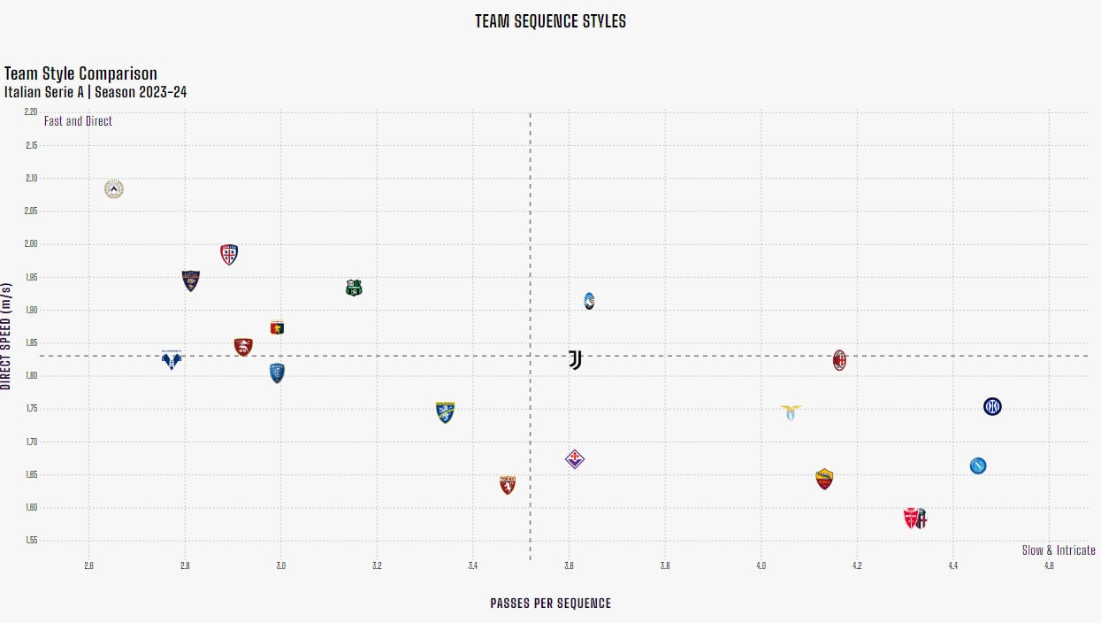 Разумеется, как частью игровой философии «Фиорентины», этим уже не удивишь. Однако именно график позволяет наглядно понять, в какой стилистической точке развития находится флорентийский клуб сейчас. Близость с «Торино» не случайна: «фиалки» действительно стали почти столь же медлительными при вертикальных атаках. Их родство ещё и символично, так как преемственно: год назад «быки» начали терять собственное лицо, последовательно отказавшись от высокого давления, а затем и от резких рывков при владении; теперь же сигнатурные черты «Фиорентины» растворяются во времени, хотя причина таких пертурбаций продиктована, как кажется, осторожностью Итальяно, в то время как туринцы просто сбавили в «физике».