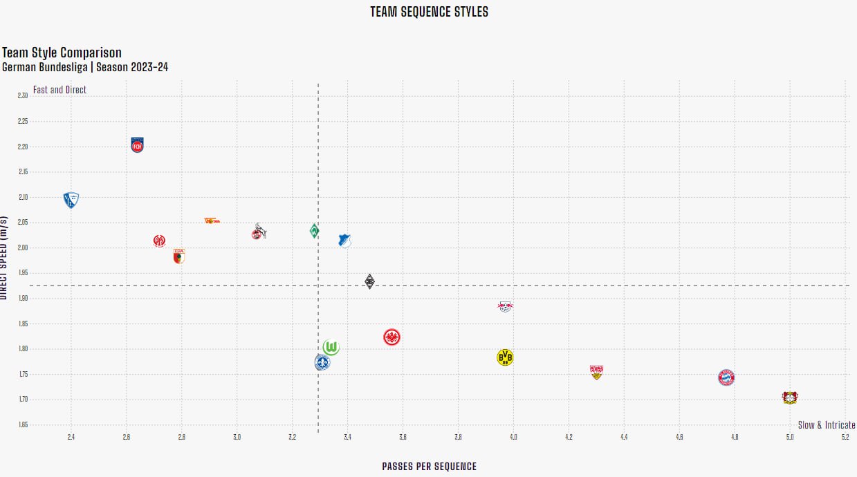 В Германии куда заметнее корреляция между положением команды в таблице и её плейстайлом. Первые шесть клубов справа налево полностью отвечают созависимости сложного комбинационного футбола и высоких спортивных результатов. Начиная с седьмой позиции, происходят незначительные корреляционные флуктуации, но глобальной сути это не меняет: играешь во владение без чрезмерной вертикализации (столь любимой в Бундеслиге) – находишься выше, строишь футбол от контратак – твоя вотчина это подвал таблицы.