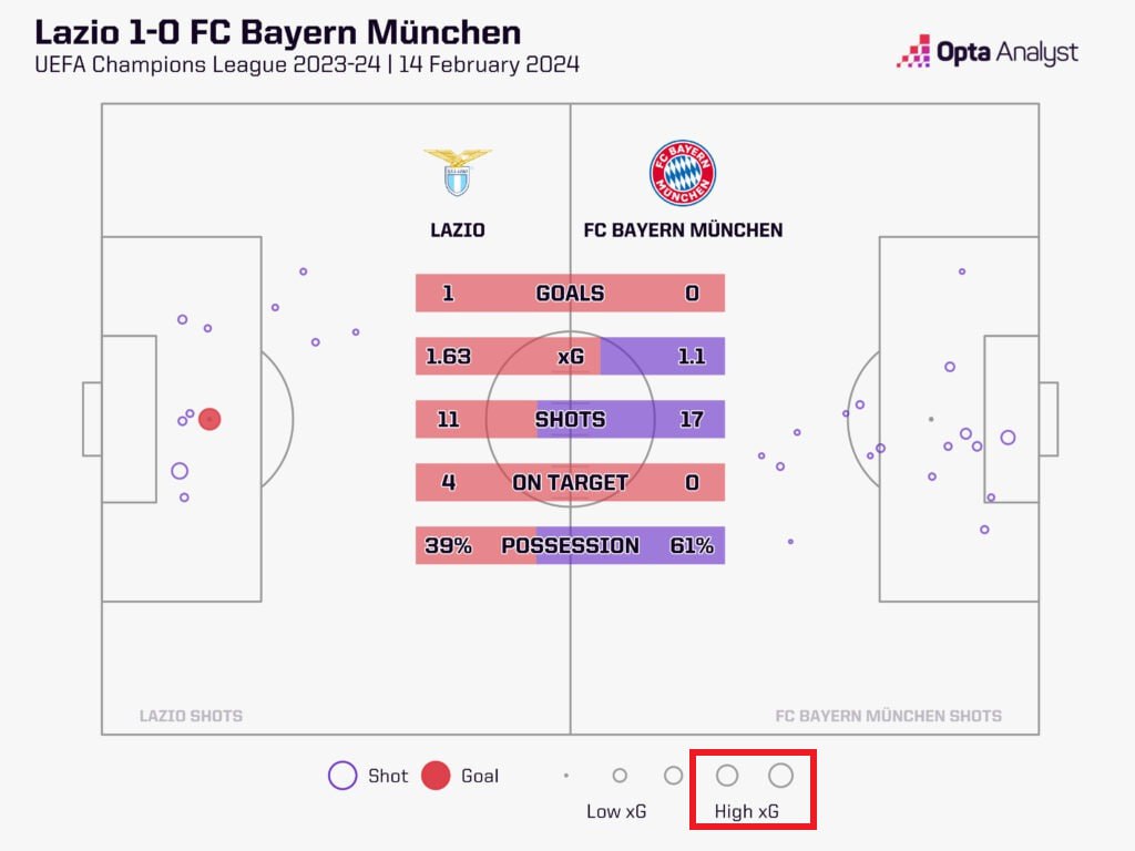 Opta в очередной раз напоминает, что «Бавария» в Риме не нанесла ни одного удара в створ (против четырёх у «Лацио»), а ещё подсвечивает иллюзорность опасности моментов гостей в штрафной. Компьютерный симулятор не котирует высоко даже попытку Мусиалы в первом тайме, делая акцент на том, что в кластере High xG у мюнхенцев полный штиль.