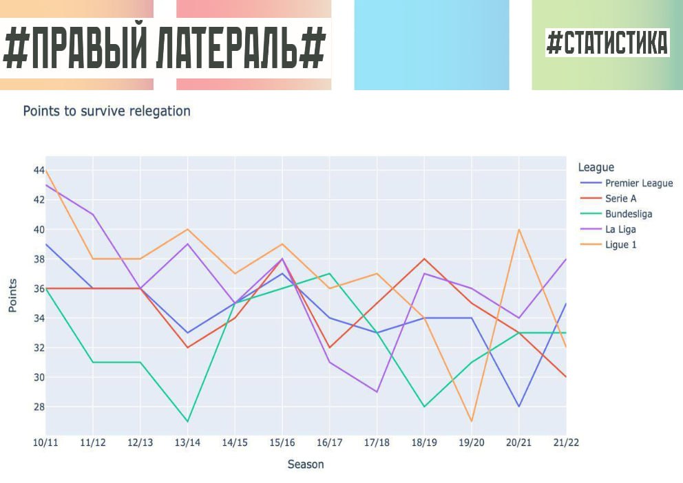 Некоторые любят проводить параллель между уровнем лиги и градусом борьбы за чемпионство/еврокубки/выживание. Последний пункт всегда был особенно спорным, так как в трясине часто вязнут не просто менее сильные по набору исполнителей команды, но и клубы-лазареты, банкроты и т.д. Ниже – временной график с пороговыми значениями баллов, необходимых для сохранения прописки в элите. Здесь много любопытного.