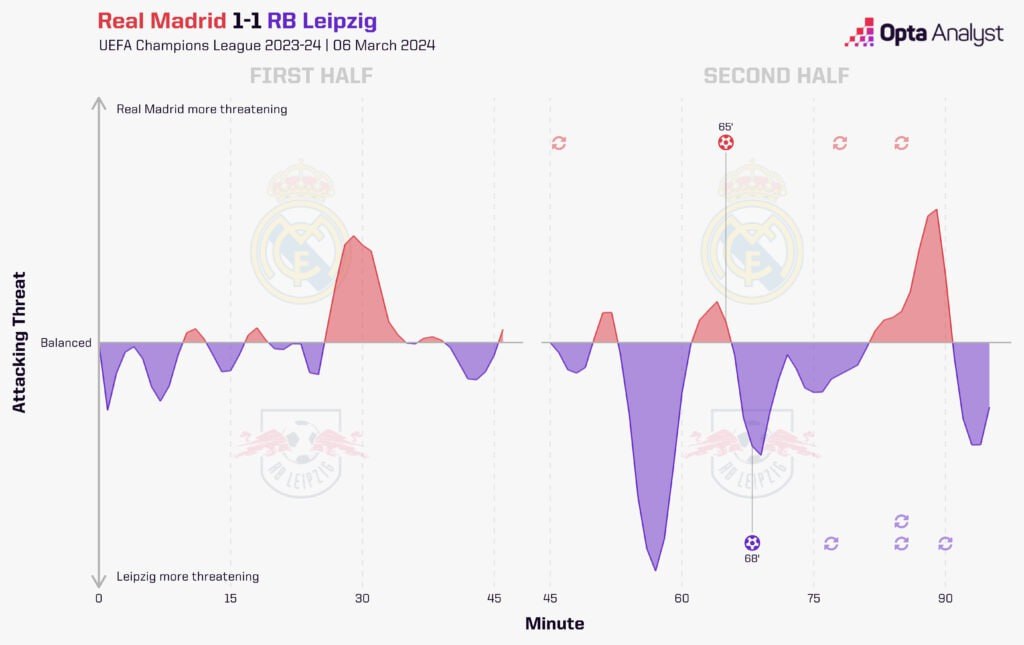 «Лейпциг» закончил матч с 20-ю ударами, что стало рекордным показателем для клуба в матчах плей-офф ЛЧ. Вальяжность мадридцев, если это была именно она, поистине поражала. Для них вполне типично заигрывать с соперником в первом матче, но в ответках им присуща хладнокровность. Вчера же их сдача инициативы казалась срежиссированной только поначалу – очень скоро стало понятно, что хозяева играют не по счёту, а от соперника. Диаграмма от Opta отлично отображает суть происходящего на игровых отрезках: кратковременные вспышки активности от «Реала» – преимущественно контратаки.