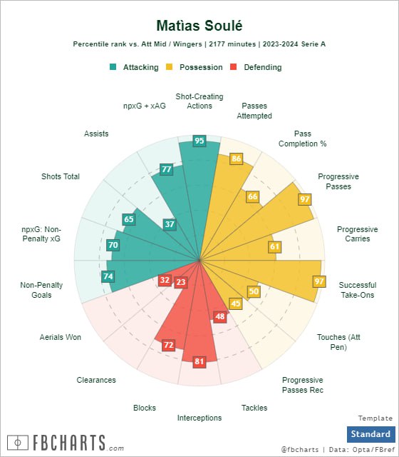 Матиас Суле – персонаж, игру которого неправомерно оценивать через призму цифр, как принято на этом канале. Это убивает суть отношения к аргентинскому игроку, как к волшебнику, творящему магию на полях Апеннин. Тренерско-игроцкий симбиоз Ди Франческо и Суле – лучшее, что могло случиться с обоими в этом сезоне. Первому нужен был умный и талантливый проводник его идей на поле, второму – ласковый ментор, могущий произвести его качественную огранку для взрослого футбола.