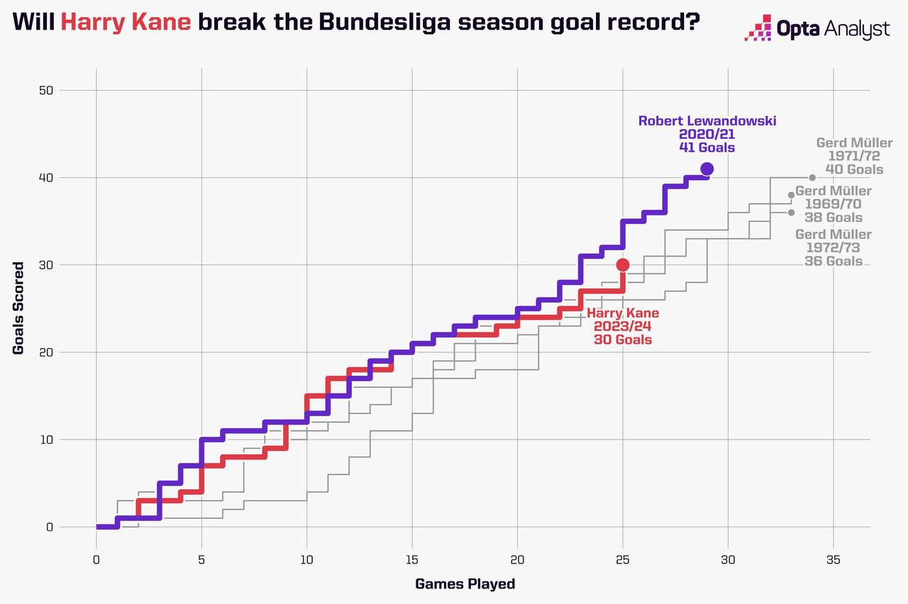 У Кейна есть ещё девять туров, чтобы повторить или даже превзойти рекорд Левандовского по голам за сезон. В розыгрыше 2020-21 поляк огорчил вратарей 41 раз, причём сделал это всего за 29 матчей (1,41 гола за игру). Харри, несмотря на уже четыре хет-трика в Бундеслиге, отстаёт от Роберта на 11 мячей. Кроме того, даже мощнейший оверперформ англичанина (30 забитых против 25 ожидаемых) не гарантирует ему достижения результата Левандовского, ведь у Кейна в среднем 1,2 гола за игру.