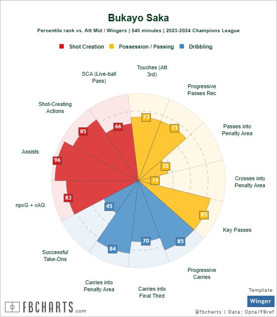 В продолжение темы о футболистах «Арсенала», входящих в топ самых опекаемых соперниками в нынешней ЛЧ, стоит отдельно обратить внимание на кластер Dribbling у Букайо Саки. В этом компоненте его кейс куда показательнее, чем у Хаверца: тут и роскошные показатели Progressive carries (причём эти продвижения идут как через профильный правый полуфланг, так и через центр), и Carries into Penalty Area (опять-таки, англичанин умеет проникать с мячом как сбоку штрафной, так через коридор номинальной «девятки»). Чуть менее впечатляющие цифры по продвижению мяча в финальную треть объясняются тем, что в формации 4-3-3 этот функционал попросту возложен на других футболистов. Если в выборку включить нон-шот метрики из других кластеров, а потом выявить среднее арифметическое всех показателей атакующей креативности, Сака войдёт в тройку лучших созидателей вместе с Фоденом и Сане.