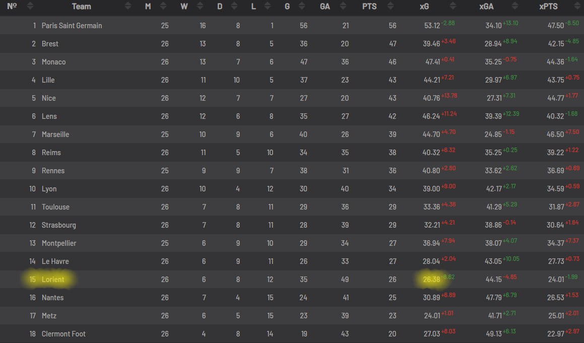 В Лиге 1 почти все команды сильно недобирают по голам: всего два клуба забили больше, чем ожидалось, причём один из них как раз «Лорьян», плетущийся на 15-ой строчке. «Мерлузовые» – самая нескучная банда из нижней части таблицы, огорчившая оппонентов уже 35 раз (вместо ожидаемых 26) и пропустившая на 5 мячей больше в свои ворота. По очкам также есть незначительный оверперформ – около двух баллов. Тем не менее, на бумаге состав «Лорьяна» достоин ещё большего: тут и одиозный экс-«горожанин» Менди, и тот же Бакайоко, поигравший в «Наполи» и «Милане», и, что самое главное, удивительный ивуарийский нападающий Мохамед Бамба, лишь в 2024-м вкусивший футбол в топ-лигах. Африканский страйкер выступал три сезона в Израиле, затем попылил год в австрийском «Вольфсберге», а перебравшись в «Лорьян» сходу стал главной надеждой клуба. Сегодня он не отличился, однако в предыдущих семи встречах забил уже шесть раз.
