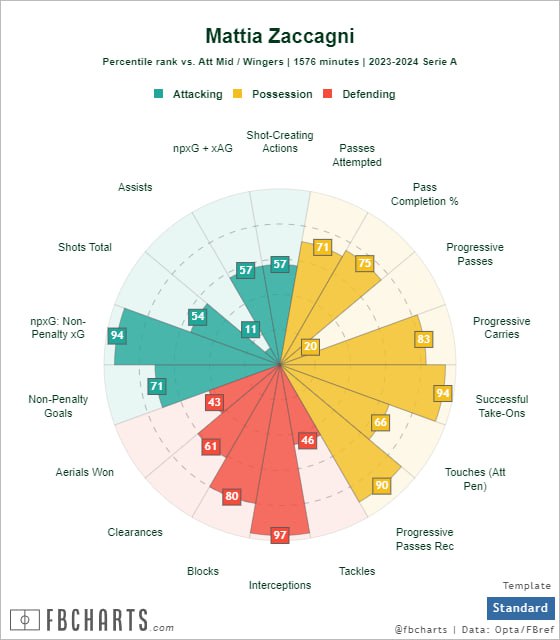 В этом сезоне Дзакканьи не потерялся даже в выборке, включающей в себя Суле, Хвичу, Леау и Вольпато. Более того, вингер «Лацио» имеет очень сбалансированный многоугольник силы, чем не могут похвастаться остальные перечисленные игроки. Учитывая, в какой футбол играла команда Сарри по ходу текущего розыгрыша, отдельного внимания заслуживает кластер Defending: космический 97 перцентиль в графе перехватов и 80 – блоков. Ахиллесовой же пятой Маттиа являются передачи с продвижением. Даунгрейд особенно ощутим, если всмотреться в показатели минувших сезонов (более чем двукратное падение). Малое число факторов говорит в пользу того, что при Тудоре произойдёт игровой ренессанс Дзакканьи, однако потеряться стилистически в футболе хорвата он не должен.