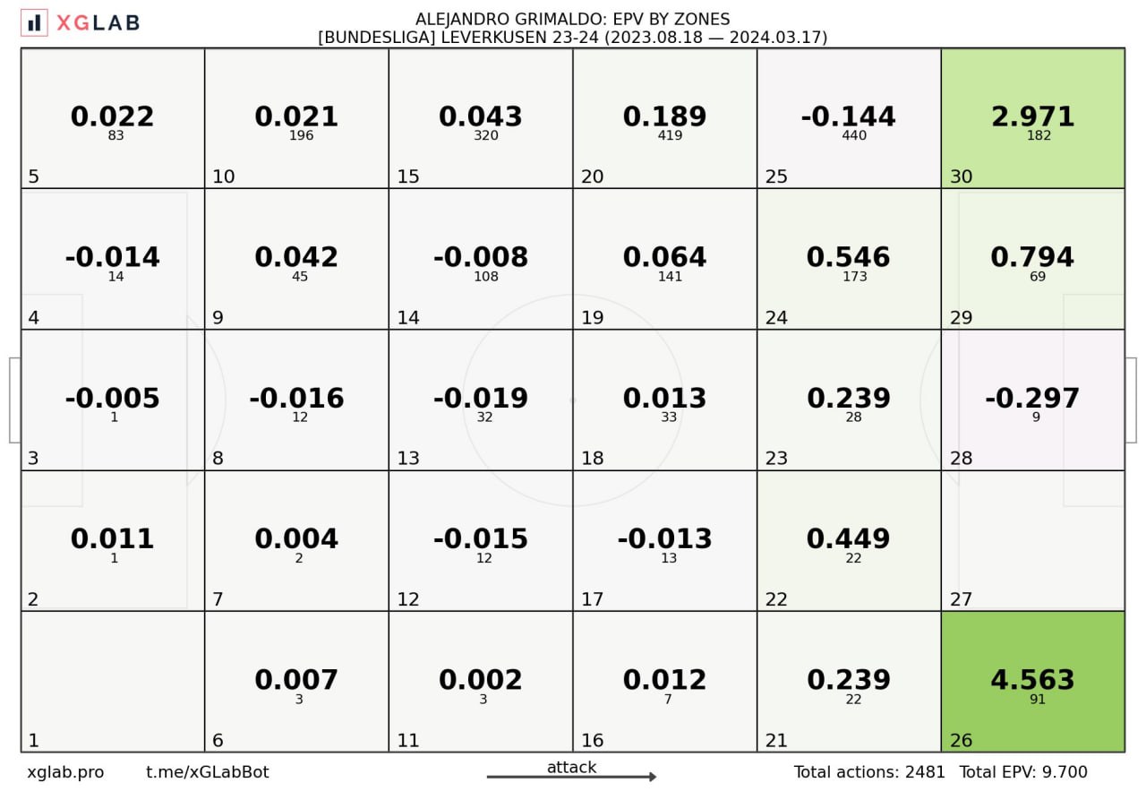 Однако чтобы осознать крутость созидательных метрик Гримальдо, достаточно лишь снова обратиться к EPV, аккумулирующему все дельные попытки игрока создать что-то с мячом. И здесь особо ценными видятся не cтолько совокупные 9.700 или же цифры на угловых(этим навыком испанца уже и впрямь не впечатлишь – его давно можно назначить официальным амбассадором корнеров в мире) , сколько великолепные показатели в зонах перед штрафной (22-24). Заметно, что Алекс не теряется даже в непрофильном центре и правом полуфланге, пускай его и заносит туда не так часто.