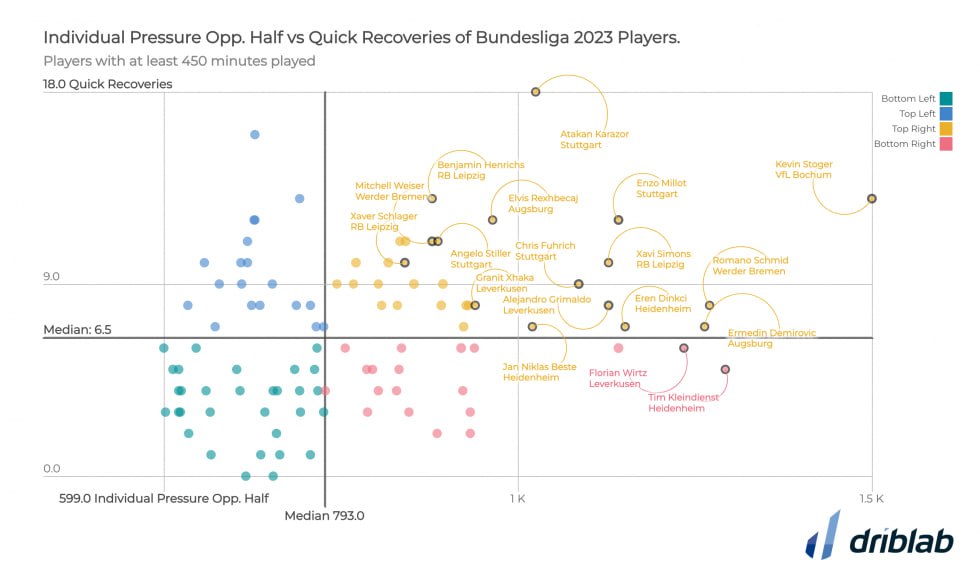 Из более значимого – иллюстративное доказательство полномасштабной трансформации игры «швабов» при Хёнессе. Сразу четыре игрока «Штутгарта» вошли в топ лучших прессингующих, составив, наконец, конкуренцию парням Розе с их симметричным зональным давлением. Отдельно отмечу Ундава, по понятным причинам не материализовавшегося на инфографике. Дело в том, что Дениз – идеальный механизм при covering shadow, с персональными же ориентировками у него сложнее. С другой стороны, футболисту его амплуа куда важнее не заниматься опекой, а перекрывать именно вектор передачи, дабы гасить атаку соперника в зачатке.
