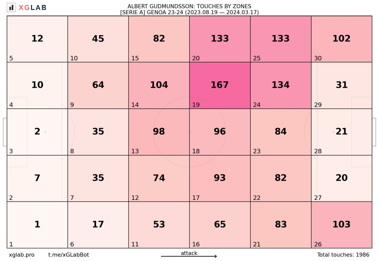 Альберт Гудмундссон – одно из главных открытий Серии А этого сезона. Причина, по которой исландец выстрелил, малообъяснима переходом Джилардино от формации с чистым наконечником к 3-5-2 с Альбертом в роли условного инсайда. Дело скорее в склонности Гудмундссона к ситуативным смещениям в свободные зоны, которые он никогда не оставляет без внимания, ведь исландец – самый ищущий пространство футболист итальянского чемпионата. Сигнатурные умения Альберта без мяча – рывки за спину, очень высокая стартовая скорость (3-й в лиге) и доведённое до автоматизма умение отклеиваться от опекуна, как только тот отворачивается. Впрочем, креатив с мячом – столь же развитая его составляющая, особенно если взять разрезающие передачи скандинава или уверенный дриблинг. Кроме того, Гудмундссон лидирует по созданным моментам со стандартов в этом сезоне среди игроков топ-5 чемпионатов – целых 45.