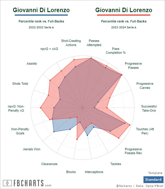 Как бы ни был невзрачен, а порой и безлик «Наполи» по сезону, в некоторых матчах он продолжает держаться за счёт трёх констант – Лоботка, Осимхен и, разумеется, Джованни. Все трое наставников, перехватывавших бразды правления командой в этом розыгрыше, делали ставку на двужильность и универсальность фулбэка. Его рабочий функционал расширился до невероятных пределов, но вместе с тем почти не потерял в качестве – что по профильным, что по вспомогательным метрикам Ди Лоренцо только прогрессировал. Ахиллесова пята игрока – лишь отборы и перехваты.